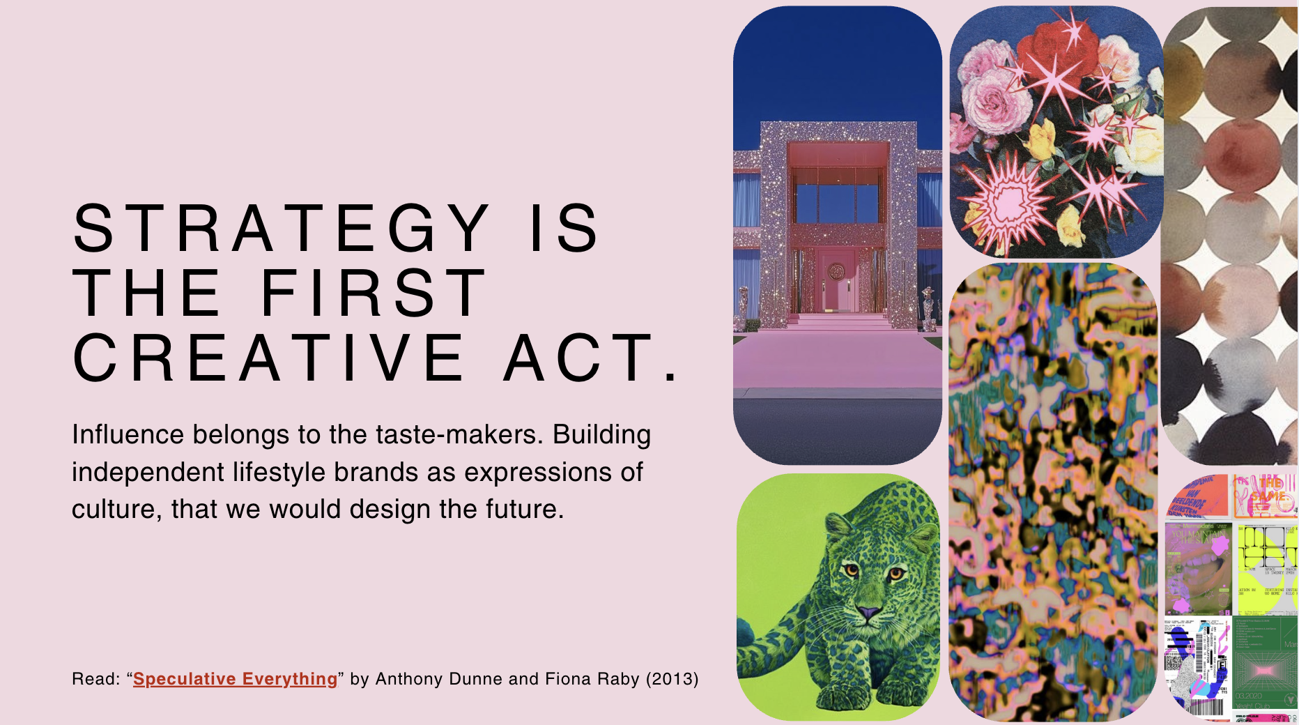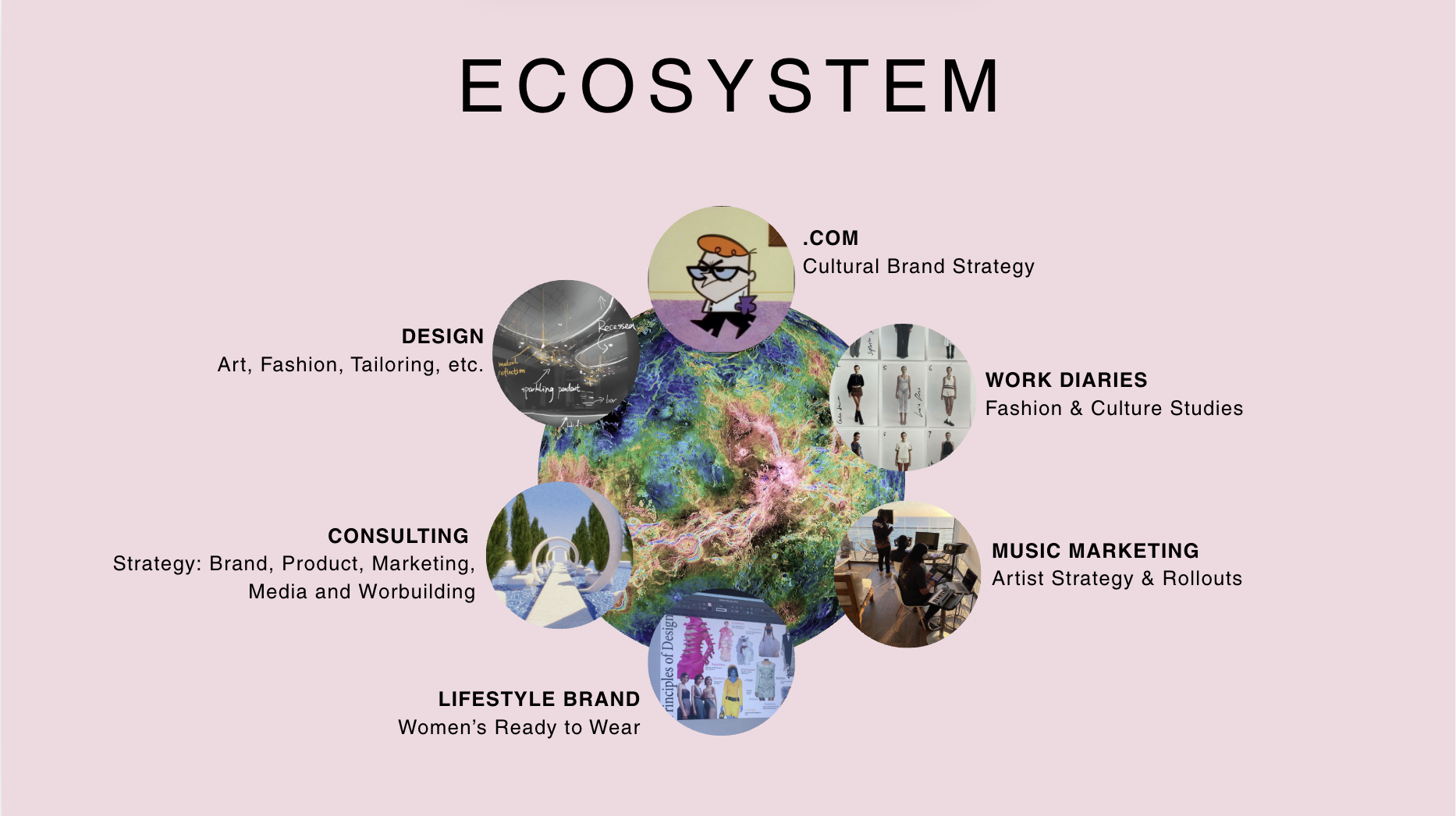 My practice is centered on the idea that cultural forms like design and strategy are methods of taste-making which can be a catalyst for social change. Reality is expressed through culture, creating a vision for our highest, most enduring values. My goal is to develop an immersive lifestyle brand presented as a utopian narrative that explores the duality of the feminine principle.